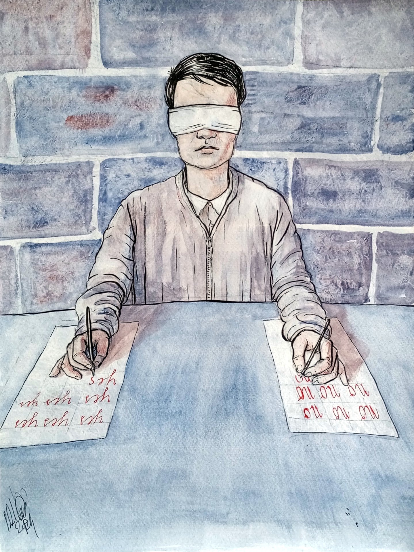 Ink and tempera on paper scene of a blindfolded man writing opposite things with both hands