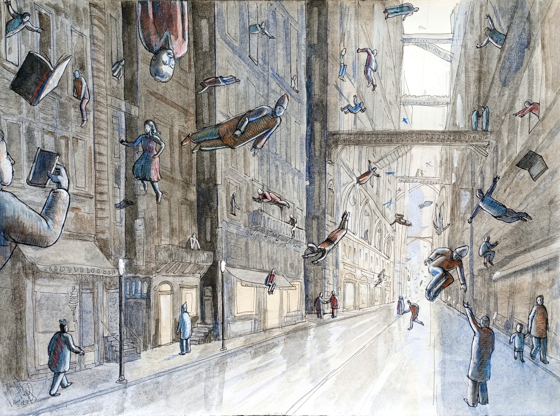 Watercolor and ink on paper of a cityscape with people floating in the air. Cm 49x35